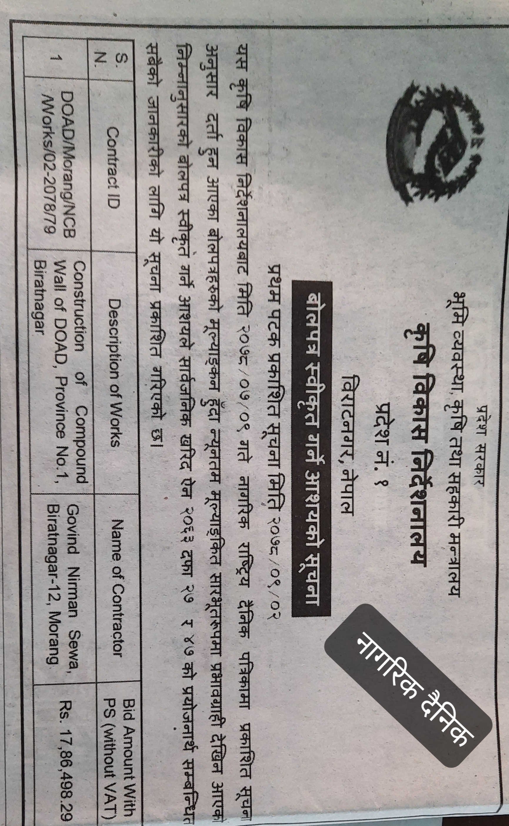 वोलपत्र स्वीकृत गर्ने आशयको सूचना