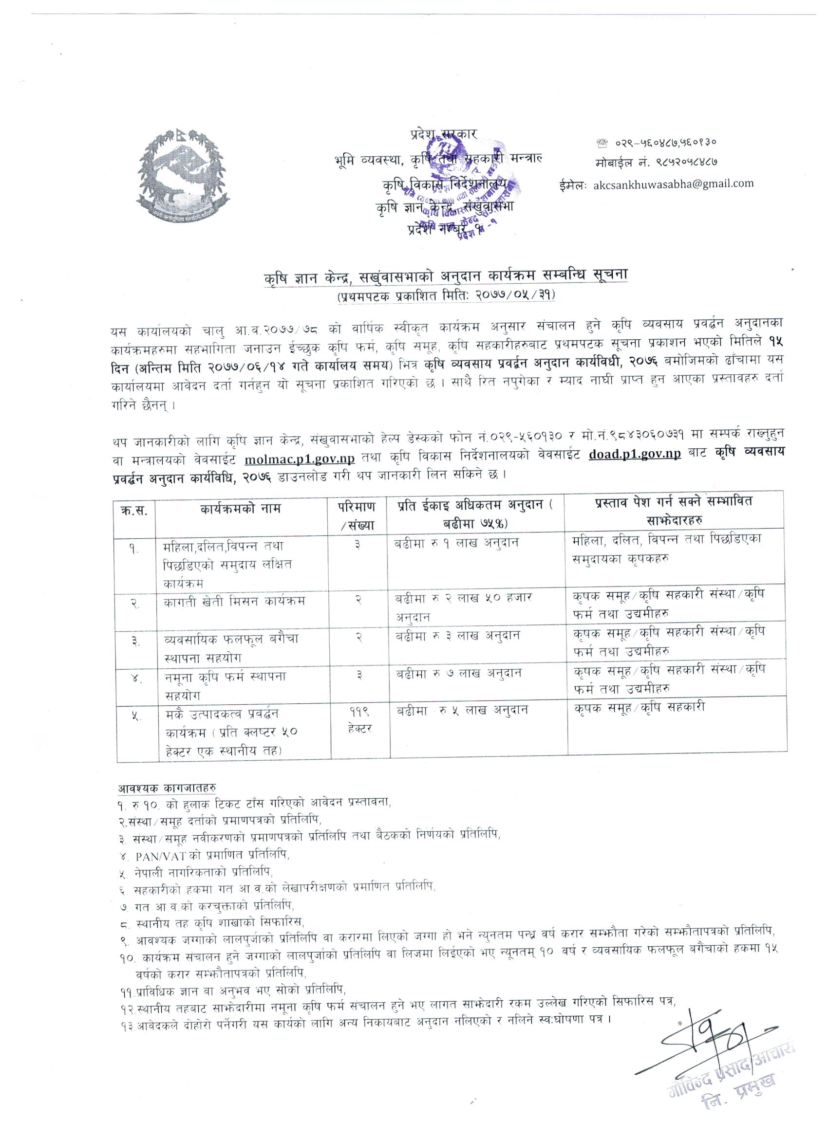 कृषि ज्ञान केन्द्र, संखुवासभाको अनुदान कार्यक्रम सम्बन्धी सुचना