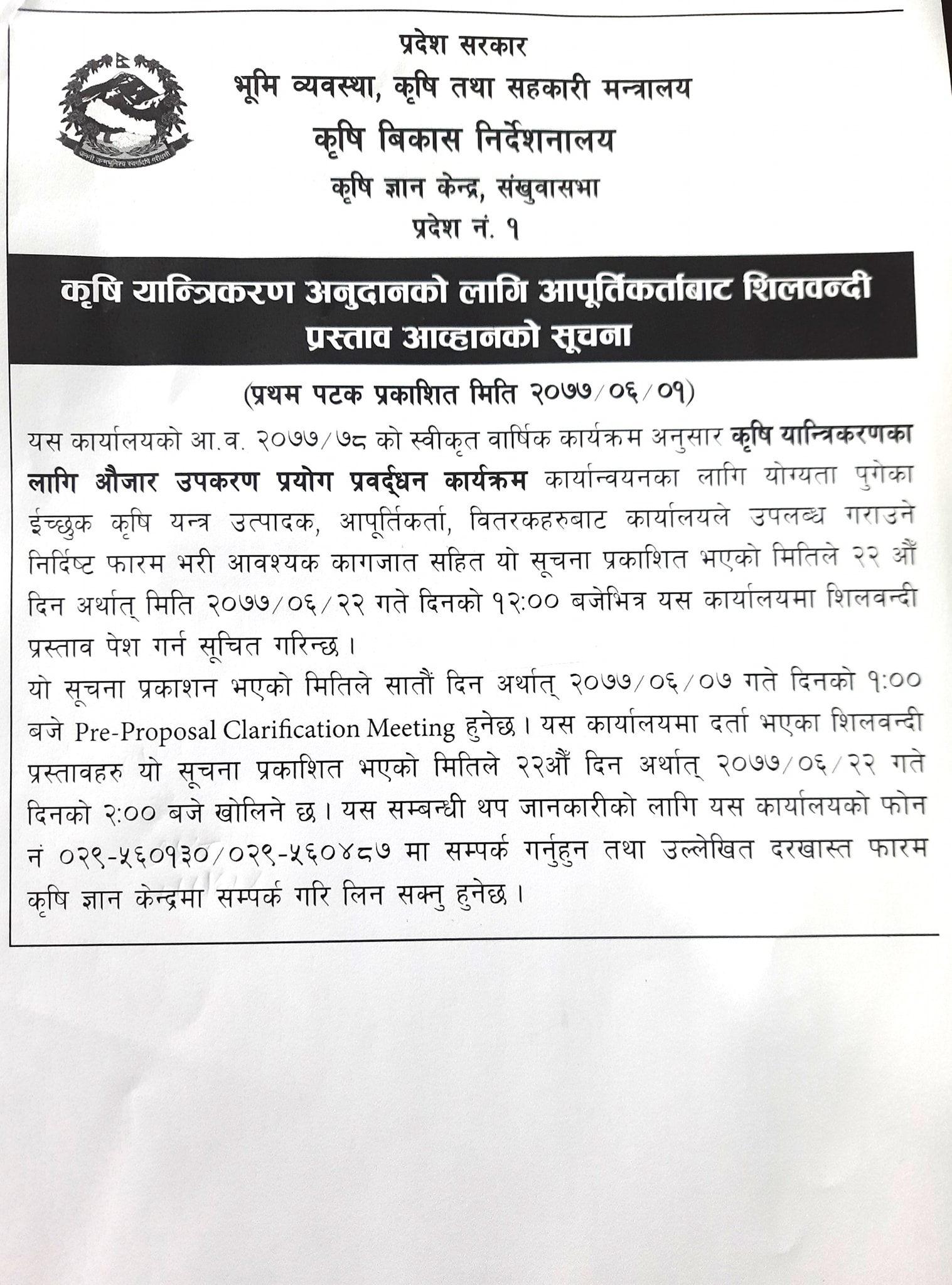 कृषि ज्ञान केन्द्र, संखुवासभाको कृषि यान्त्रिकरण अनुदानको लागि आपूर्तिकर्ताबाट शिलवन्दी प्रस्ताव आव्हान सम्बन्धी सुचना!