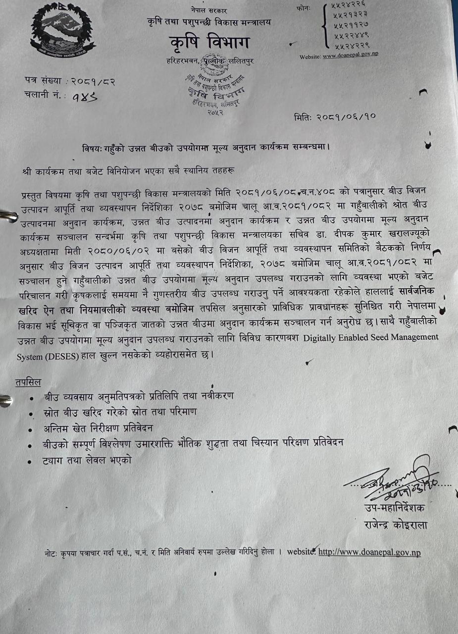 | गहुँको उन्नत बीउको उपयोगमा मूल्य अनुदान कार्यक्रम सम्बन्धीको सूचना |