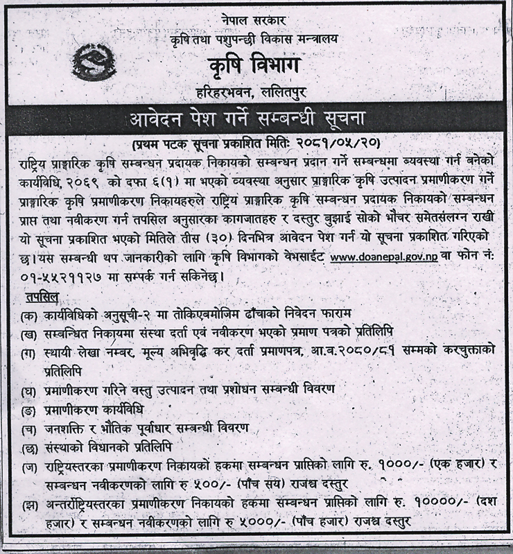 | प्राङ्गारिक कृषि प्रमाणीकरण निकायका लागि सम्बन्धन तथा नविकरण गर्ने सम्बन्धीको सूचना |