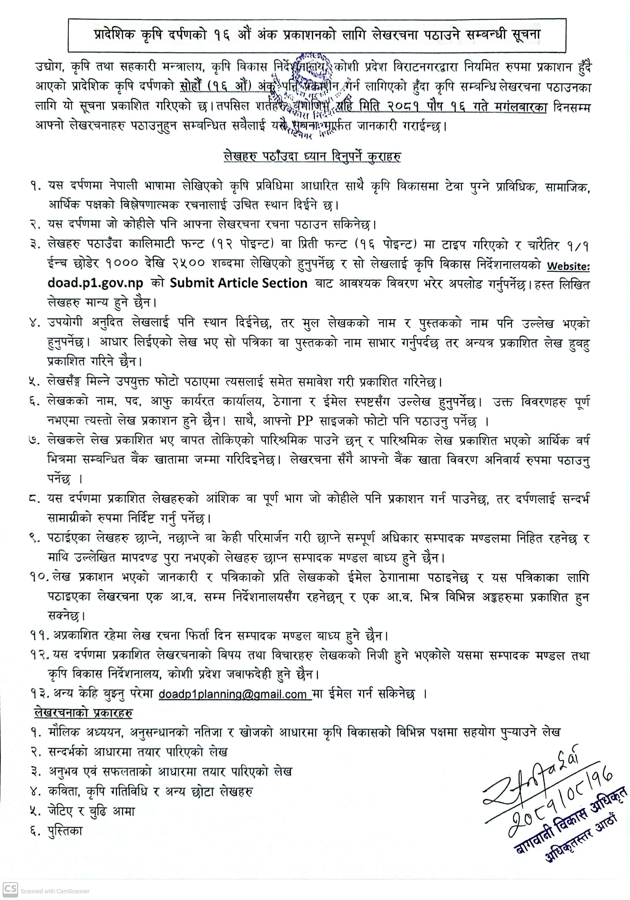 | प्रादेशिक कृषि दर्पणको १5 औं अंक प्रकाशनको लागि लेखरचना पठाउने सम्बन्धीको सूचना। |