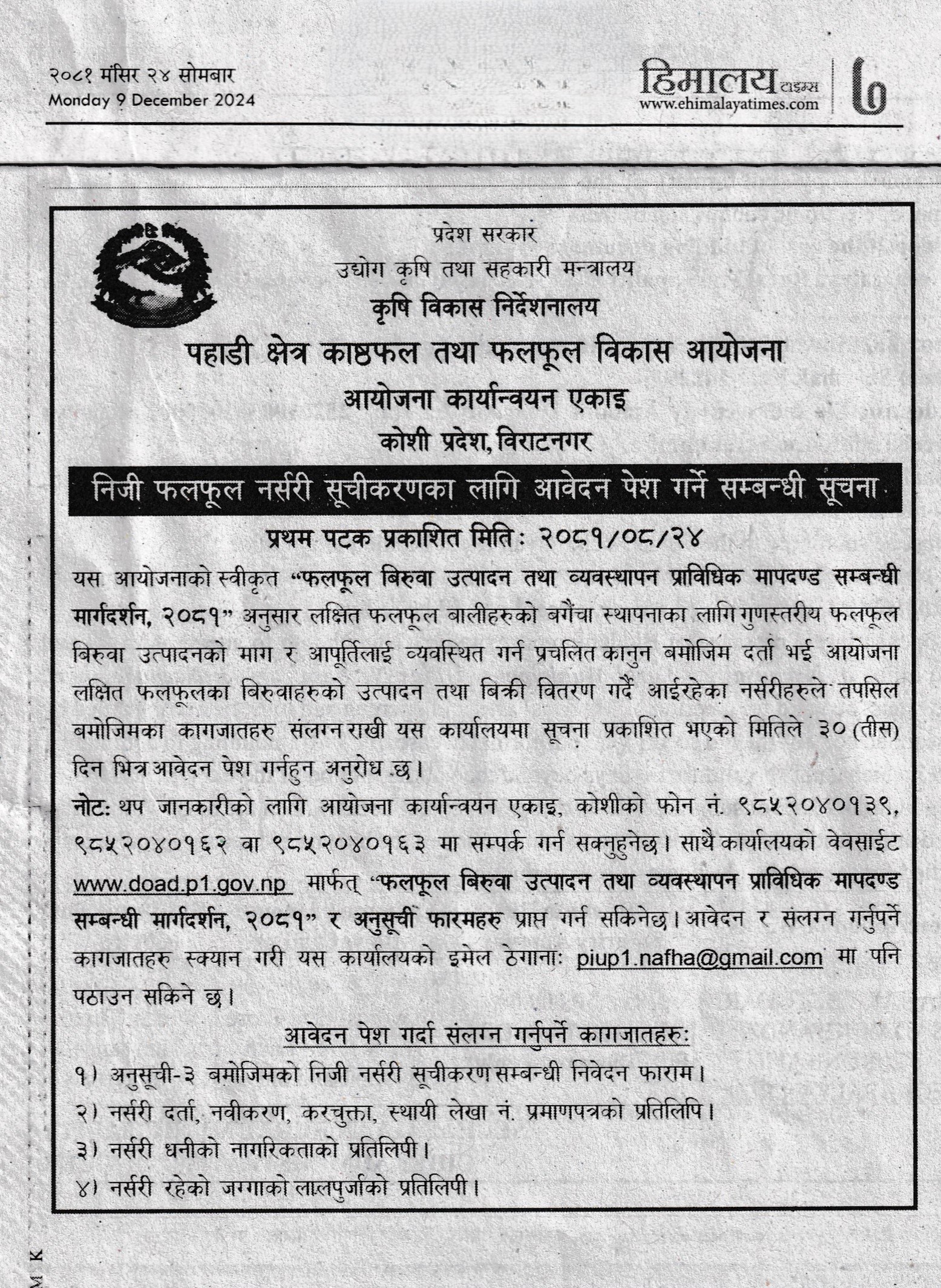 | निजी फलफूल नर्सरी सुदृढिकारणका लागि प्रस्ताव आव्हान सम्बन्धी सूचना ! |