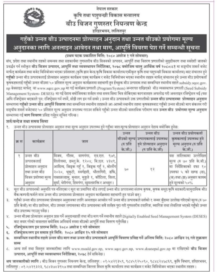 गहुँको उन्नत बीउ उत्पादनमा प्रोत्साहन अनुदान र प्रयोगमा मूल्य अनुदान सम्बन्धी सूचना