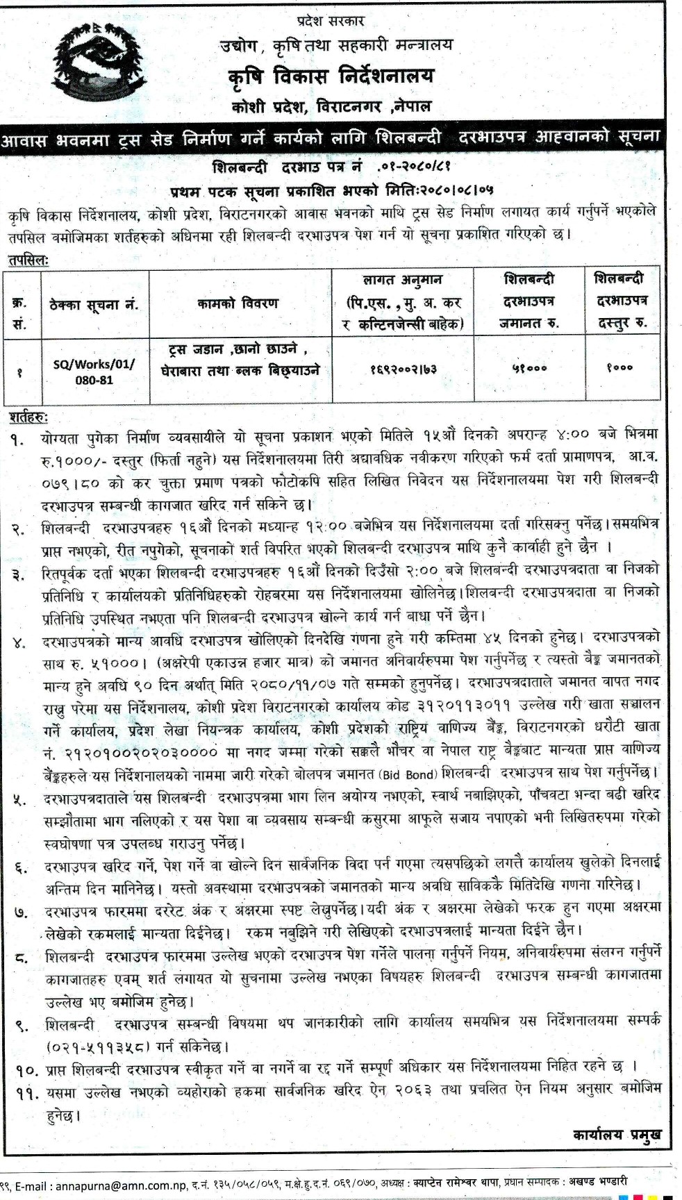 आवास भवनमा ट्रस सेड निर्माण गर्ने कार्यको लागि शिलबन्दी दरभाउपत्र आह्वानको सूचना
